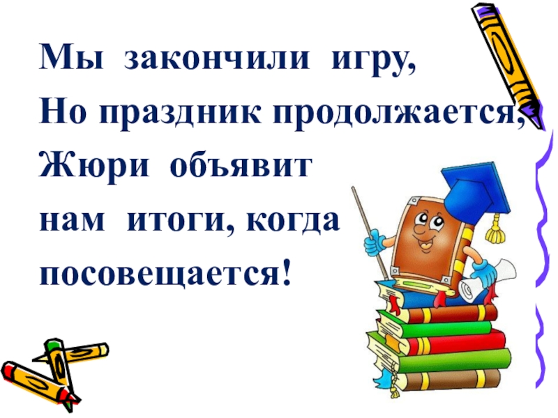 Мы закончили игру,Но праздник продолжается,Жюри объявитнам итоги, когдапосовещается!