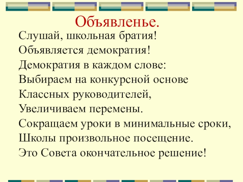 Объявленье.Слушай, школьная братия!Объявляется демократия!Демократия в каждом слове:Выбираем на конкурсной основеКлассных руководителей,Увеличиваем перемены.Сокращаем уроки в минимальные сроки,Школы произвольное