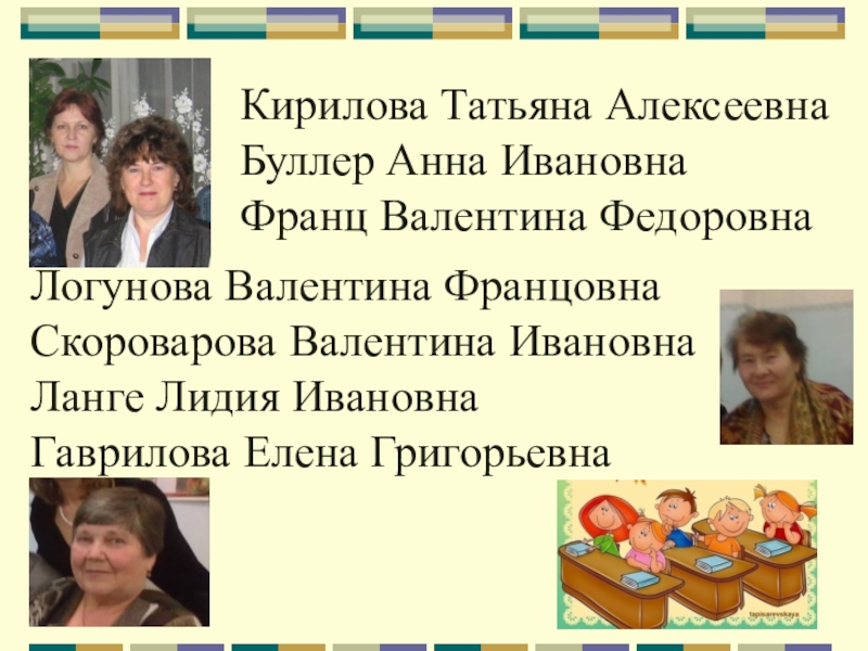 Кирилова Татьяна АлексеевнаБуллер Анна ИвановнаФранц Валентина ФедоровнаЛогунова Валентина ФранцовнаСкороварова Валентина ИвановнаЛанге Лидия ИвановнаГаврилова Елена Григорьевна