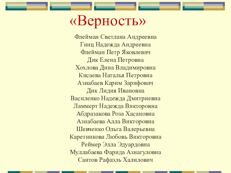 «Верность»Флейман Светлана АндреевнаГинц Надежда АндреевнаФлейман Петр ЯковлевичДик Елена ПетровнаХохлова Дина ВладимировнаКисаева Наталья ПетровнаАзнабаев Карим ЗарифовичДик Лидия ИвановнаВасиленко