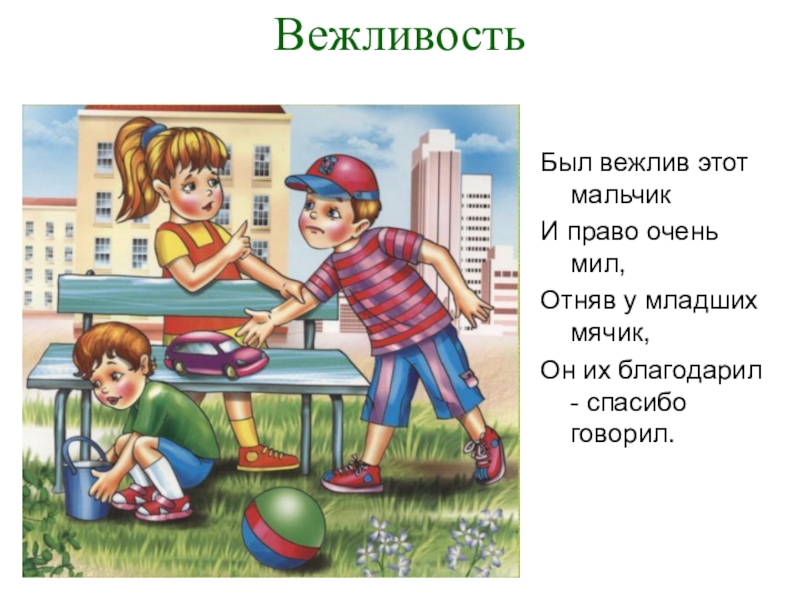 ВежливостьБыл вежлив этот мальчикИ право очень мил,Отняв у младших мячик,Он их благодарил - спасибо говорил.