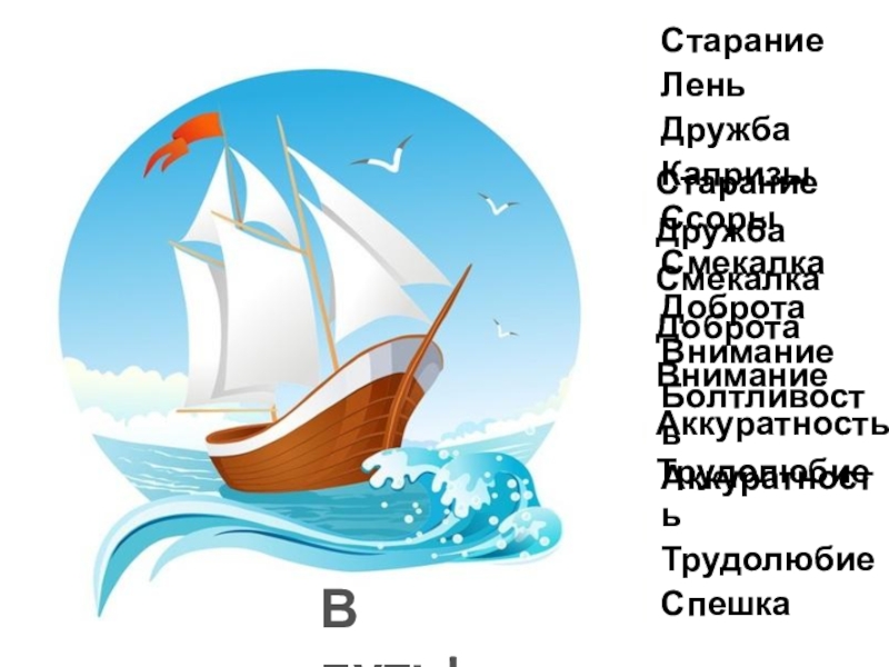 СтараниеЛень ДружбаКапризыСсоры СмекалкаДобротаВниманиеБолтливость АккуратностьТрудолюбиеСпешка СтараниеДружбаСмекалкаДобротаВниманиеАккуратностьТрудолюбиеВ путь!