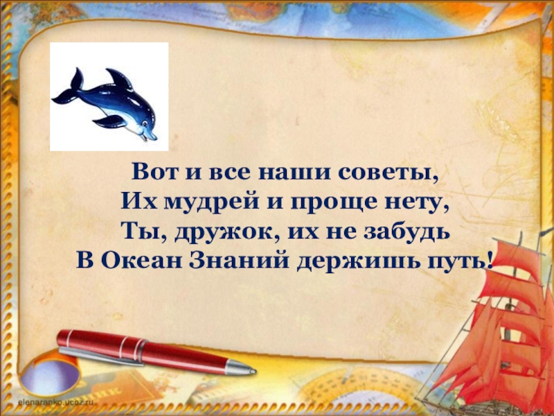Вот и все наши советы, Их мудрей и проще нету, Ты, дружок, их не забудь В Океан