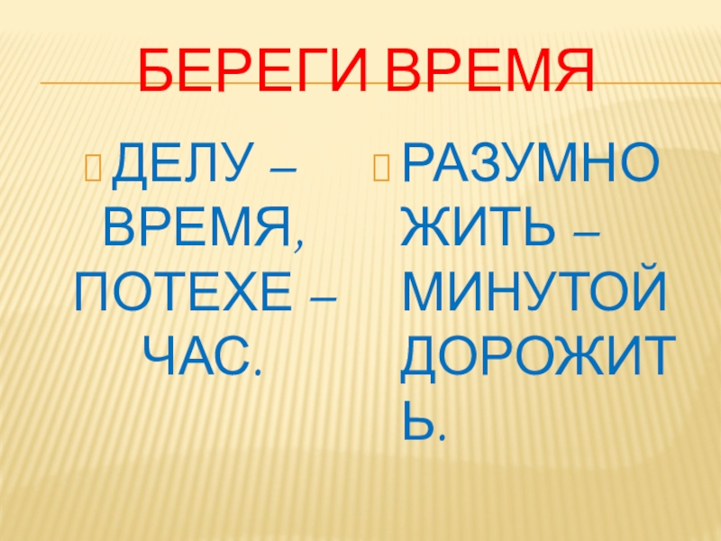 БЕРЕГИ ВРЕМЯДЕЛУ – ВРЕМЯ, ПОТЕХЕ – ЧАС.РАЗУМНО ЖИТЬ – МИНУТОЙ ДОРОЖИТЬ.