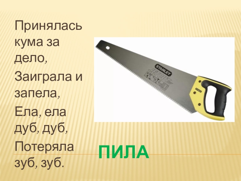 ПИЛАПринялась кума за дело,Заиграла и запела,Ела, ела дуб, дуб, Потеряла зуб, зуб.