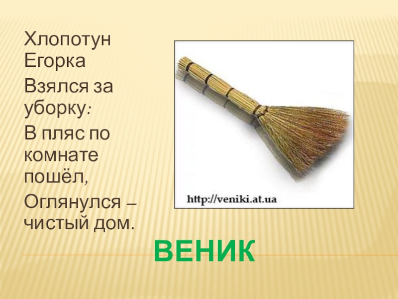 ВЕНИКХлопотун ЕгоркаВзялся за уборку:В пляс по комнате пошёл,Оглянулся – чистый дом.