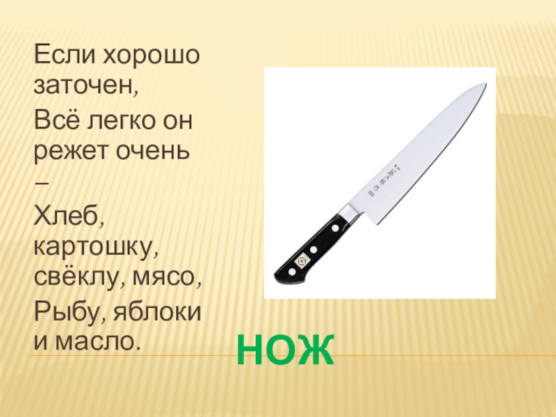 НОЖЕсли хорошо заточен, Всё легко он режет очень – Хлеб, картошку, свёклу, мясо, Рыбу, яблоки и масло.