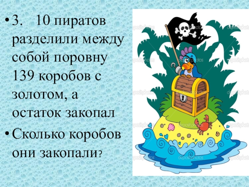 Слайд 163. 10 пиратов разделили между собой поровну 139 коробов с золотом,