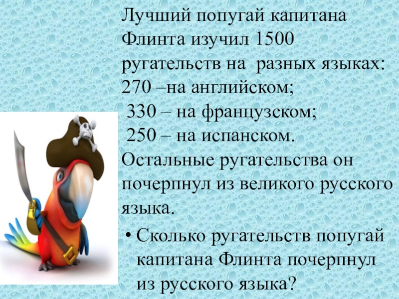 Слайд 15Лучший попугай капитана Флинта изучил 1500 ругательств на разных языках: 270