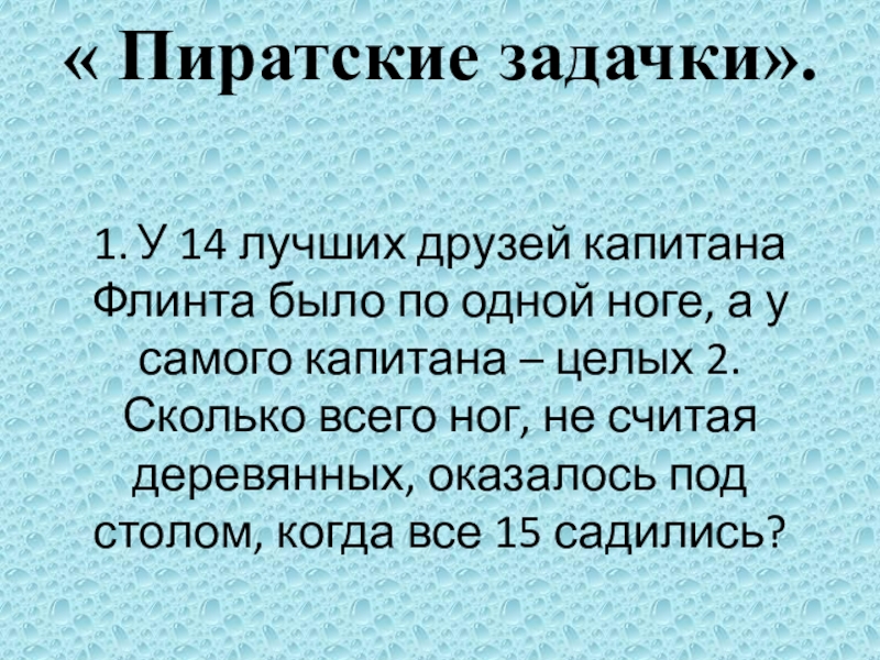 Слайд 14 « Пиратские задачки». 1. У 14 лучших друзей капитана Флинта было по одной
