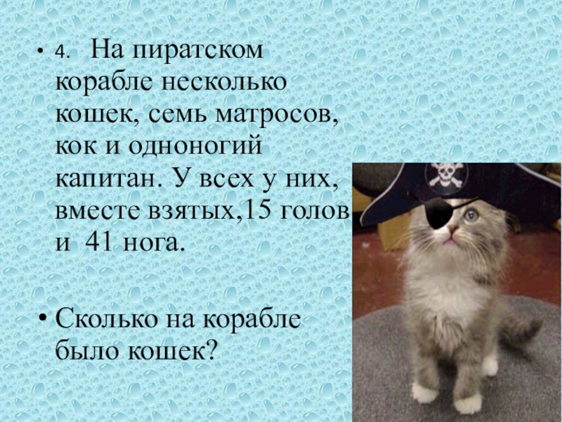 4.	На пиратском корабле несколько кошек, семь матросов, кок и одноногий капитан. У всех у них, вместе взятых,15