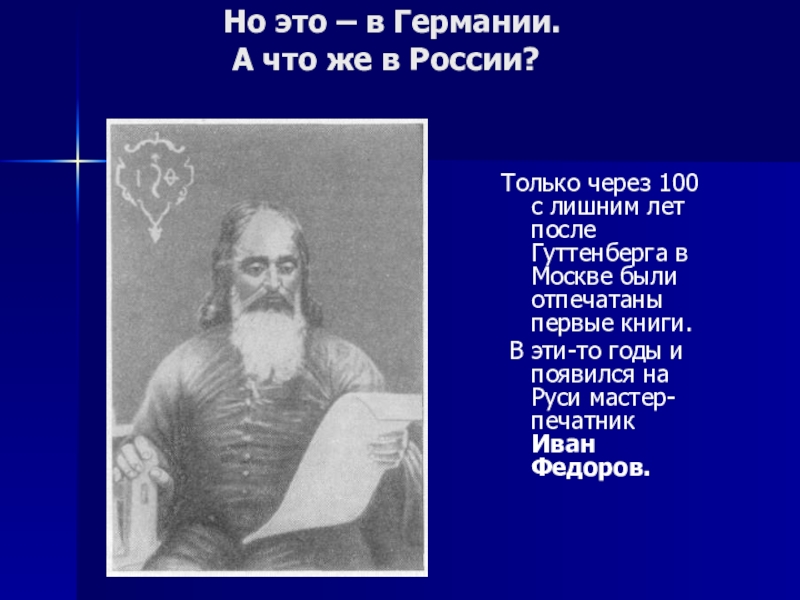 Только через 100 с лишним лет после Гуттенберга в Москве были отпечатаны первые книги.