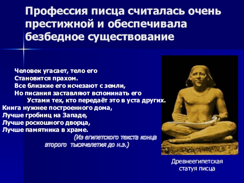 Профессия писца считалась очень престижной и обеспечивала безбедное существование