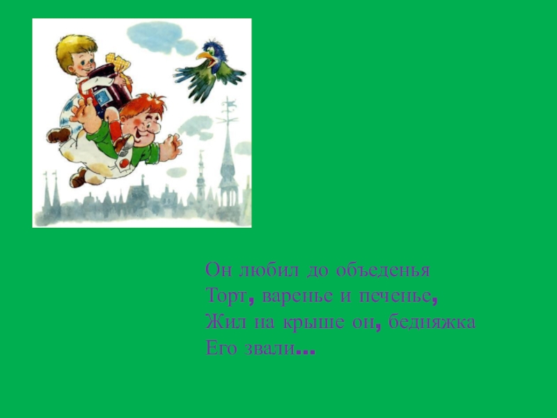 Он любил до объеденьяТорт, варенье и печенье,Жил на крыше он, бедняжкаЕго звали…