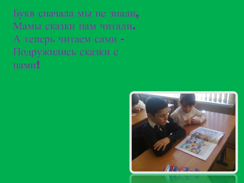 Букв сначала мы не знали,Мамы сказки нам читали.А теперь читаем сами -Подружились сказки снами!