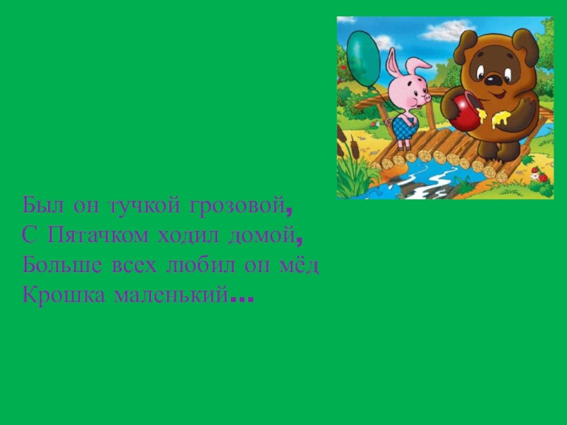 Был он тучкой грозовой,С Пятачком ходил домой,Больше всех любил он мёдКрошка маленький…