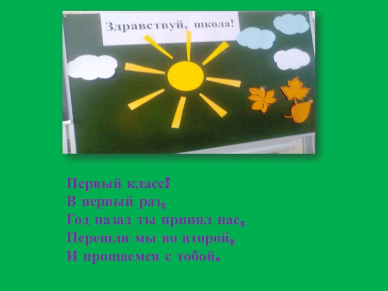 Первый класс! В первый раз,Год назад ты принял нас,Перешли мы во второй,И прощаемся с тобой.