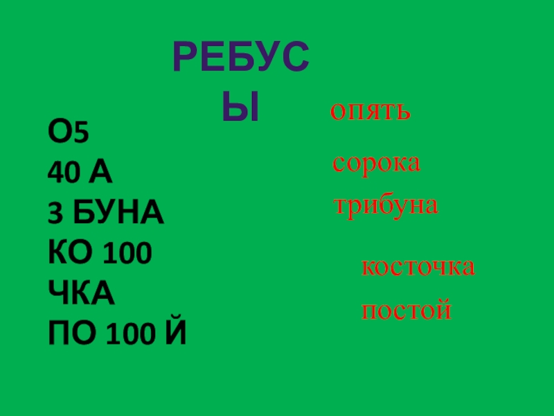 О540 А3 БУНАКО 100 ЧКАПО 100 ЙРебусыопятьсорокатрибунакосточкапостой