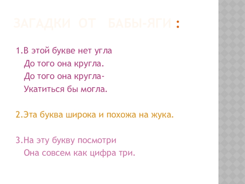 Загадки от  бабы-яги :1.В этой букве нет угла  До того она кругла.  До того