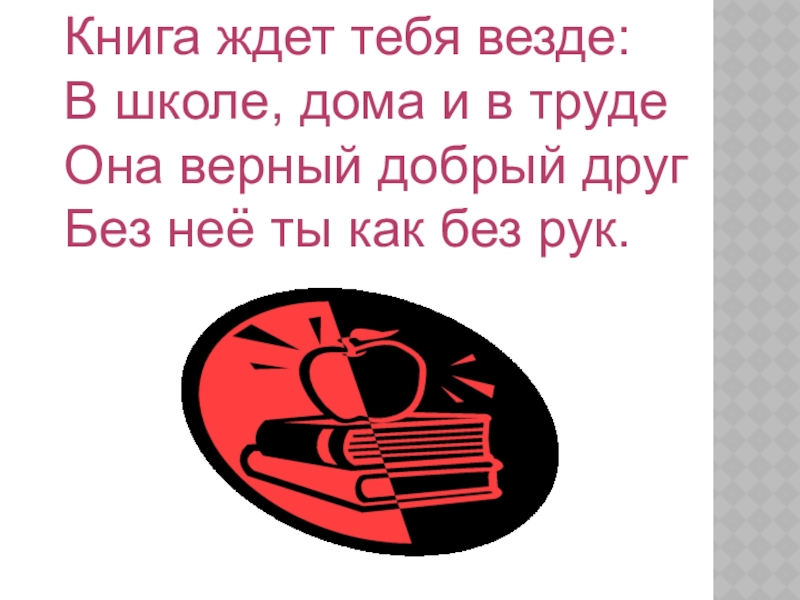 Книга ждет тебя везде: В школе, дома и в труде Она верный добрый друг Без неё ты