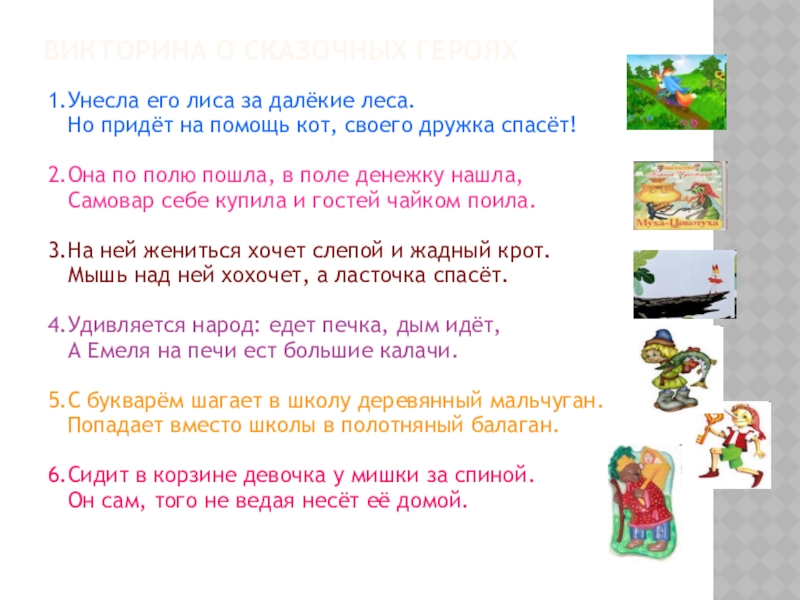 Викторина о сказочных героях1.Унесла его лиса за далёкие леса.  Но придёт на помощь кот, своего дружка
