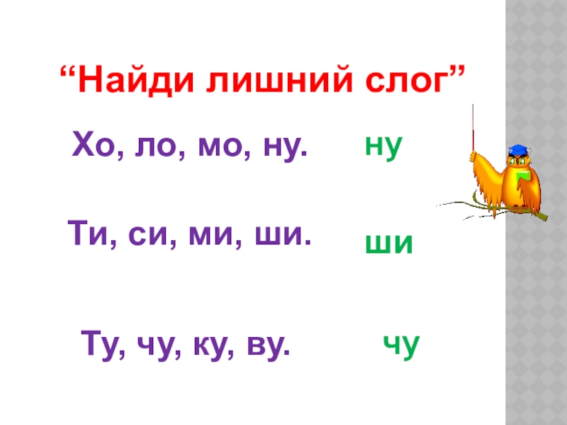 “Найди лишний слог”Хо, ло, мо, ну.нуТи, си, ми, ши.шиТу, чу, ку, ву.чу