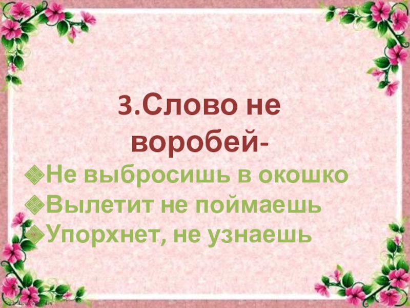 3.Слово не воробей-Не выбросишь в окошкоВылетит не поймаешьУпорхнет, не узнаешь