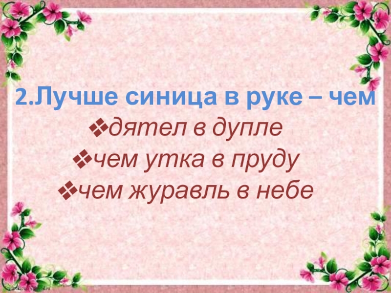 2.Лучше синица в руке – чем дятел в дуплечем утка в прудучем журавль в небе
