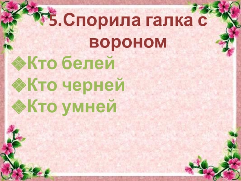 5.Спорила галка с ворономКто белейКто чернейКто умней