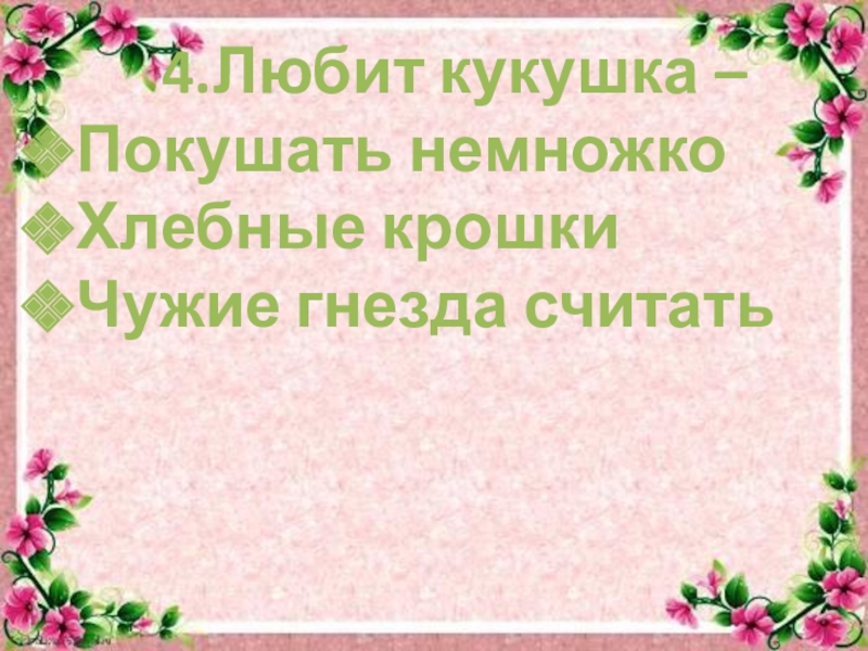 4.Любит кукушка –Покушать немножкоХлебные крошкиЧужие гнезда считать