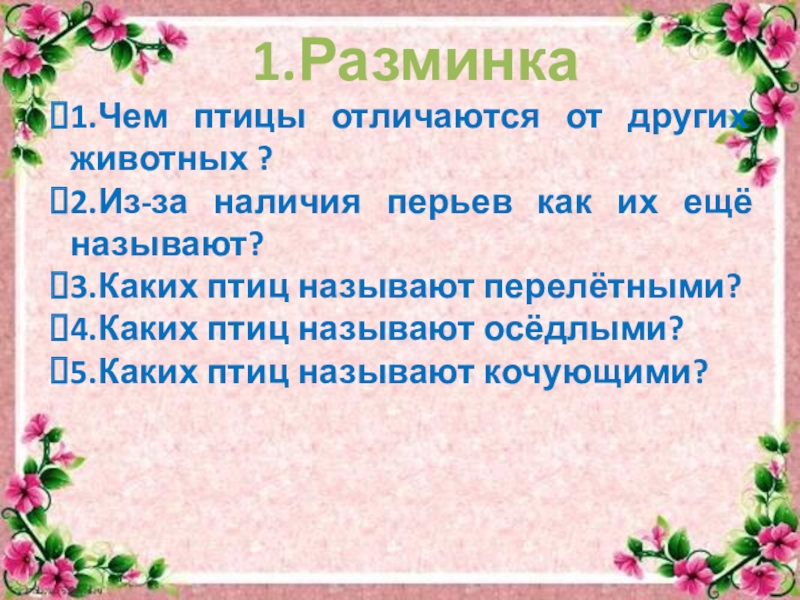 1.Разминка1.Чем птицы отличаются от других животных ? 2.Из-за наличия перьев как их ещё называют? 3.Каких птиц называют
