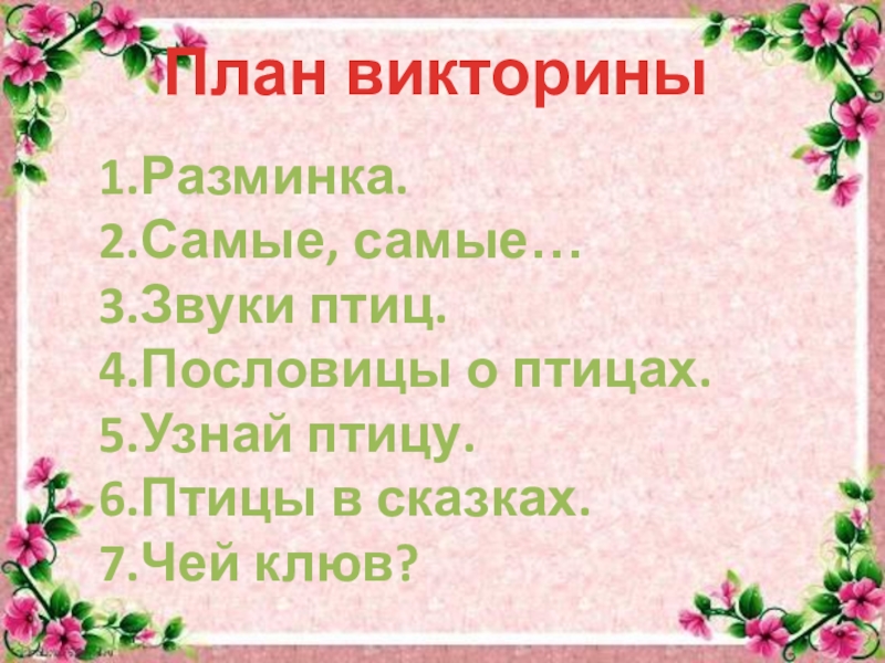 План викторины1.Разминка.2.Самые, самые…3.Звуки птиц.4.Пословицы о птицах.5.Узнай птицу. 6.Птицы в сказках.7.Чей клюв?