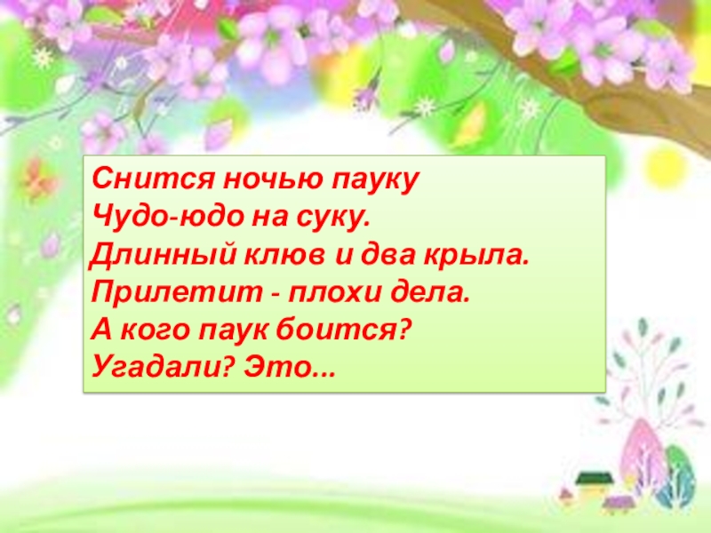 Слайд 3Снится ночью пауку Чудо-юдо на суку. Длинный клюв и два крыла. Прилетит - плохи