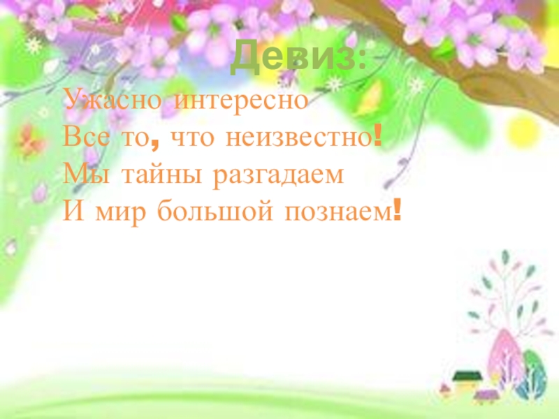 Девиз:Ужасно интересноВсе то, что неизвестно!Мы тайны разгадаемИ мир большой познаем!