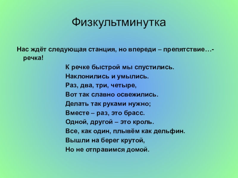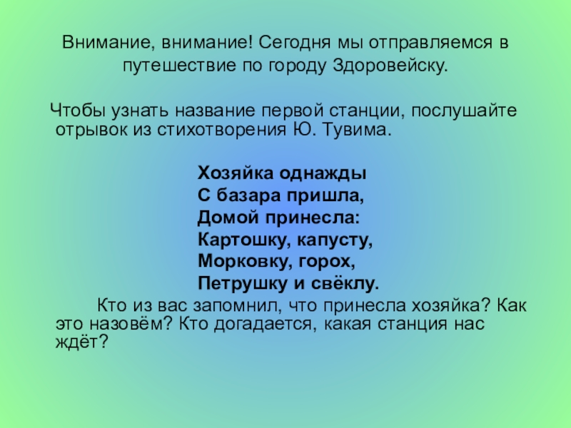 Чтобы узнать название первой станции, послушайте отрывок из стихотворения Ю. Тувима.