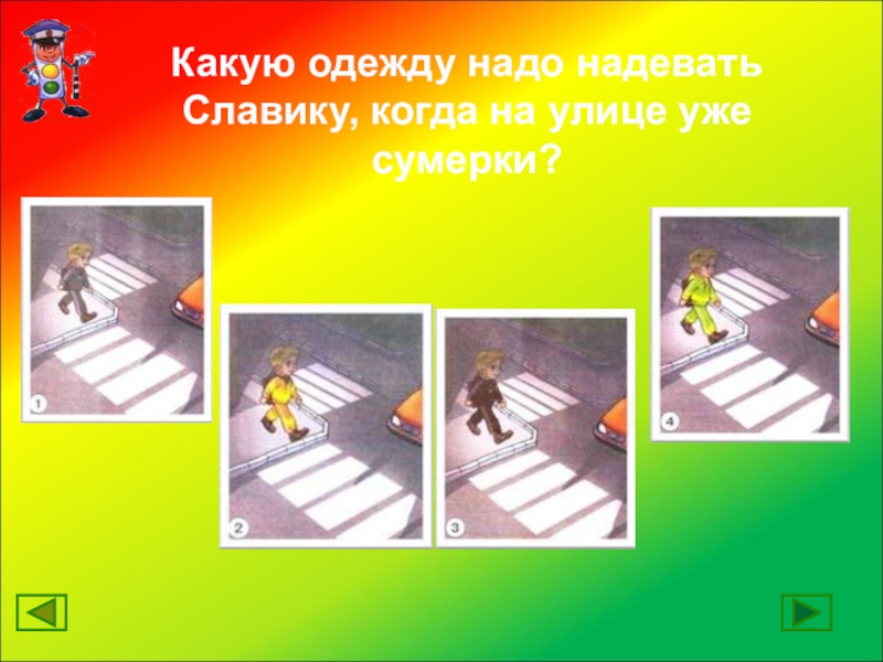 Слайд 5Какую одежду надо надевать Славику, когда на улице уже сумерки?