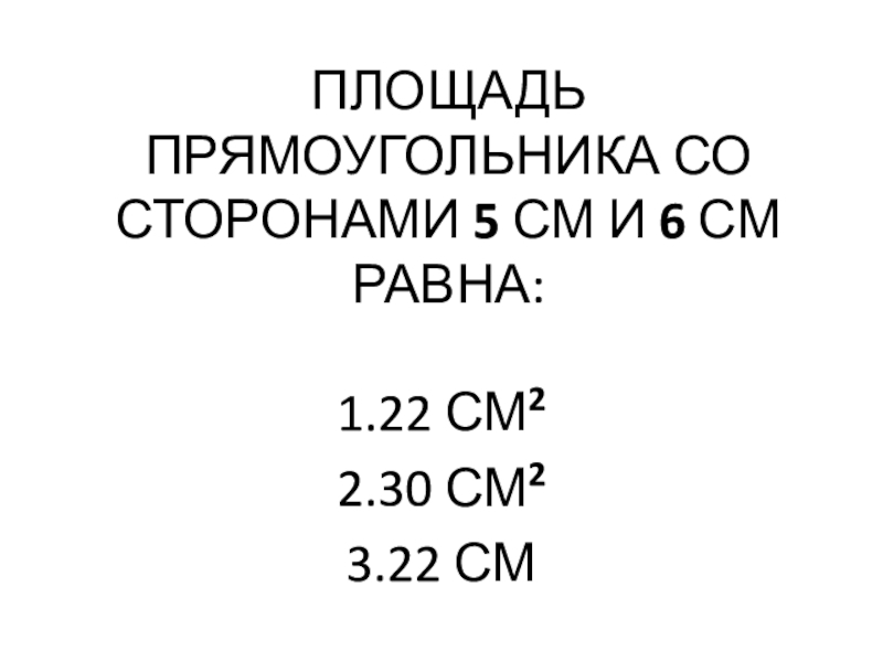 Слайд 48ПЛОЩАДЬ ПРЯМОУГОЛЬНИКА СО СТОРОНАМИ 5 СМ И 6 СМ РАВНА: