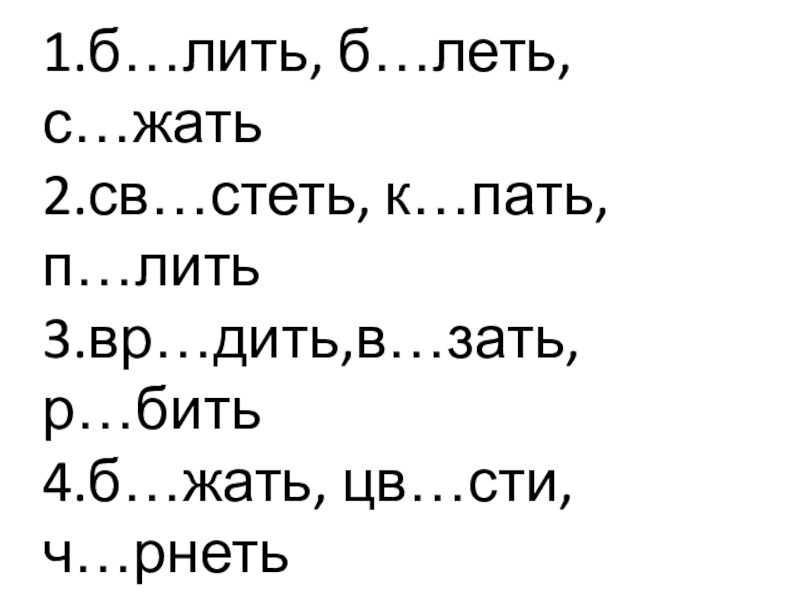 1.б…лить, б…леть, с…жать 2.св…стеть, к…пать, п…лить 3.вр…дить,в…зать,р…бить 4.б…жать, цв…сти, ч…рнеть