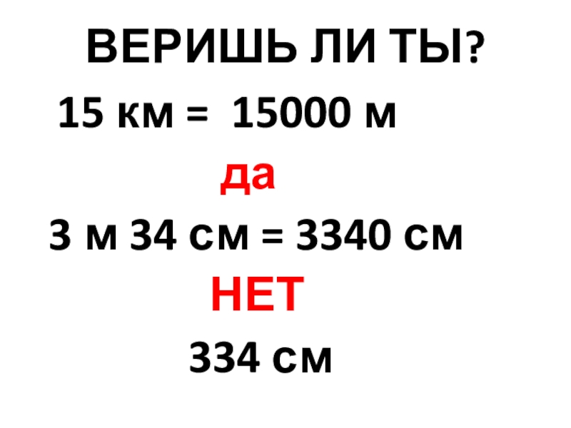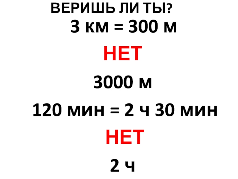 ВЕРИШЬ ЛИ ТЫ? 3 км = 300 мНЕТ3000 м 120 мин = 2 ч 30 мин НЕТ2