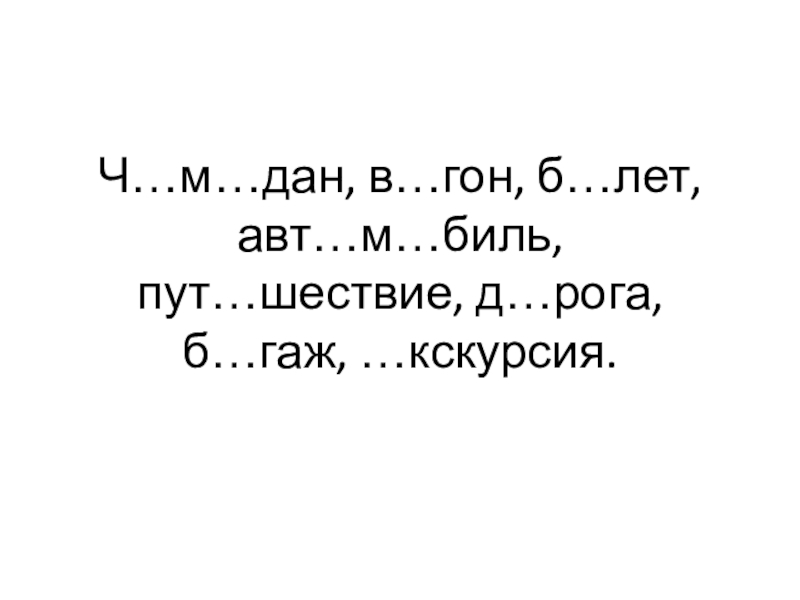 Слайд 7Ч…м…дан, в…гон, б…лет, авт…м…биль, пут…шествие, д…рога, б…гаж, …кскурсия.