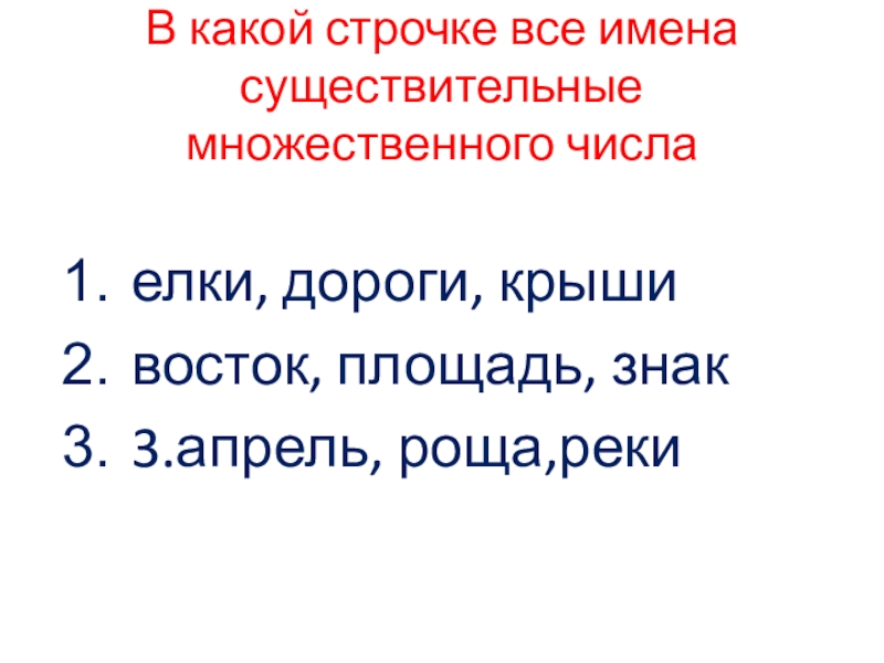 В какой строчке все имена существительные множественного числаелки, дороги, крышивосток, площадь, знак3.апрель, роща,реки