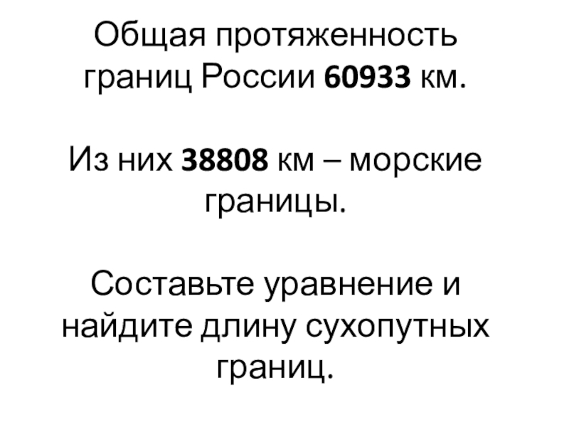 Общая протяженность границ России 60933 км.   Из них 38808 км – морские границы.   Составьте