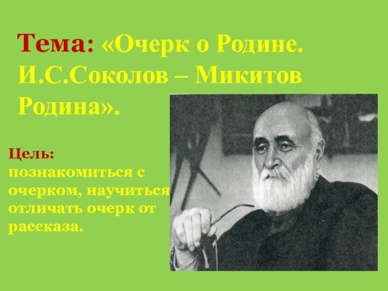 Тема: «Очерк о Родине. И.С.Соколов – Микитов Родина».Цель: познакомиться с очерком, научиться отличать очерк от рассказа.