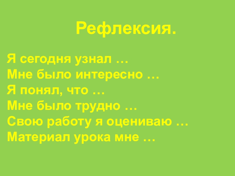 Рефлексия.Я сегодня узнал …Мне было интересно …Я понял, что …Мне было трудно …Свою работу я оцениваю …Материал