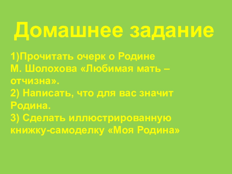 Домашнее задание1)Прочитать очерк о Родине М. Шолохова «Любимая мать – отчизна».2) Написать, что для вас значит Родина.3)