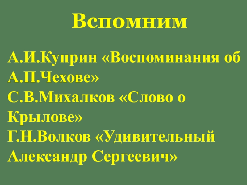 А.И.Куприн «Воспоминания об А.П.Чехове»С.В.Михалков «Слово о Крылове»Г.Н.Волков «Удивительный Александр Сергеевич»Вспомним