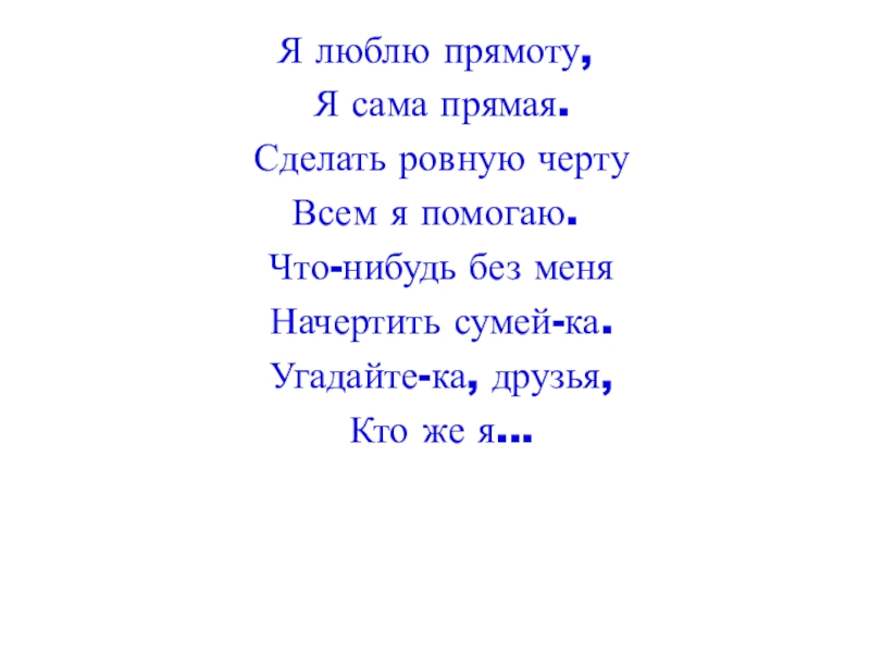 Я люблю прямоту, Я сама прямая. Сделать ровную черту Всем я помогаю. Что-нибудь без меня Начертить сумей-ка.