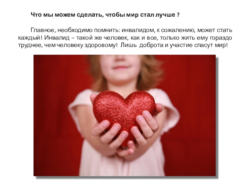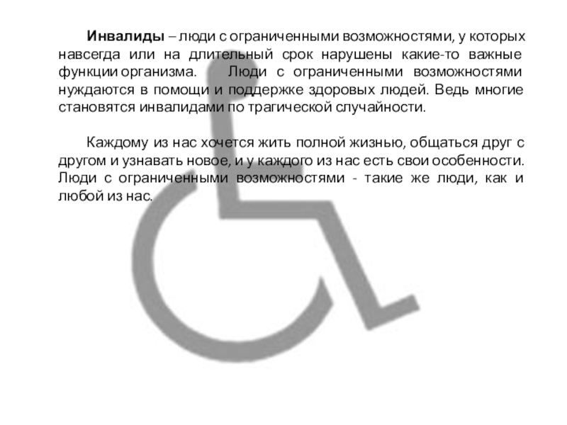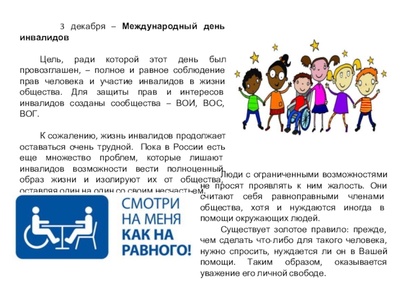 Люди с ограниченными возможностями не просят проявлять к ним жалость. Они считают себя равноправными членами общества, хотя и нуждаются иногда в помощи окружающих людей.