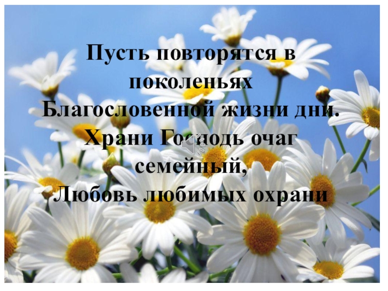 Пусть повторятся в поколеньяхБлагословенной жизни дни.Храни Господь очаг семейный,Любовь любимых охрани