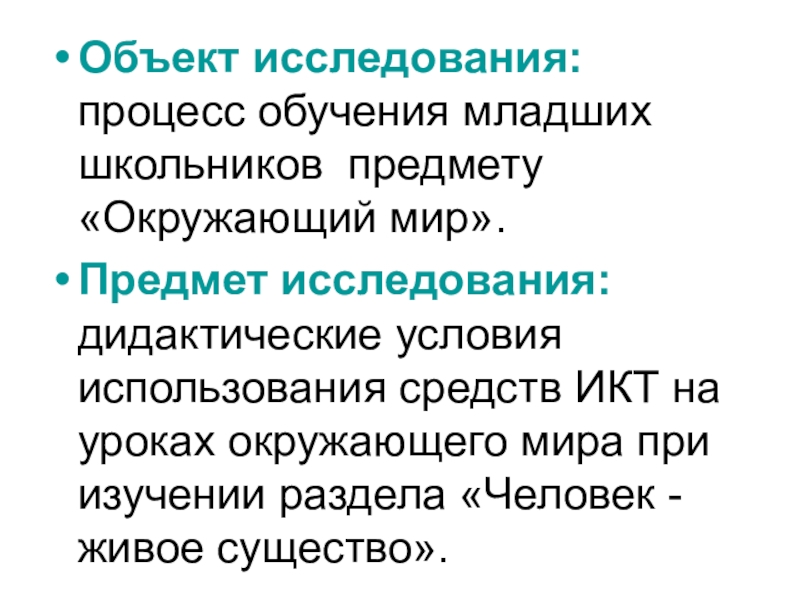 Объект исследования: процесс обучения младших школьников предмету «Окружающий мир».Предмет исследования: дидактические условия использования средств ИКТ на уроках